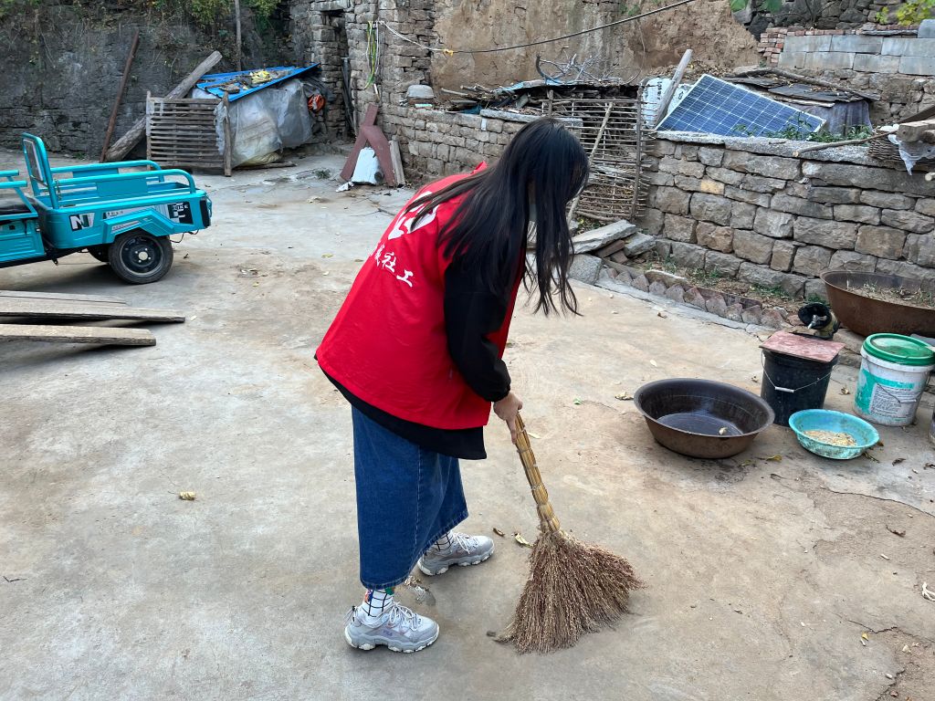 探访过程中,驻站社工详细询问老人身体状况、生活日常及需求,耐心倾听老人心声。老人拉着社工的手分享自己年轻时的故事,屋内不时传来阵阵欢声笑语。来到陈大爷(化名)家中,社工及时将院内散落的树叶清理干净,陈大爷笑着说,“谢谢孩子们的到来,让小院充满生机”。