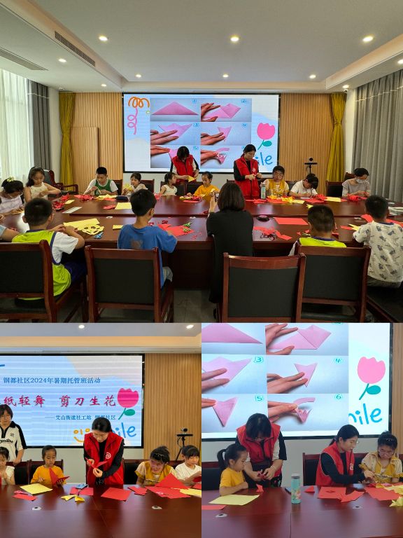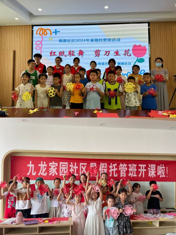 为了丰富社区暑假班儿童的生活,2024年7月23日,艾山街道社工站联合九龙家园社区、钢都社区开展了“红纸生花展芳菲 指尖传承共成长”剪纸活动。