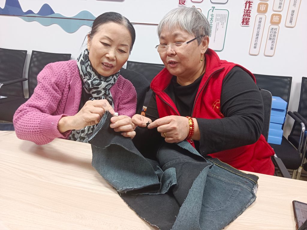 纬十路康乃馨志愿服务队是西市场街道社工站孵化的一支社区社会组织,它是由社工站开办的老年手工小组转化而来。社工们倾注心血种下一颗种子小心呵护长成树苗,再陪伴它长成大树。手工志愿小组结束后,康乃馨的队员们意犹未尽,还想将手工活动继续下去,于是他们挖掘自身优势资源,推举队员朱阿姨当老师教导大家将废旧牛仔裤改造成挎包,朱阿姨欣然答应。