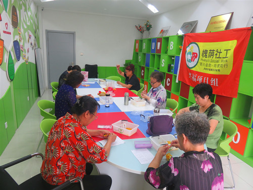 活动伊始,社工根据成员日常的接受能力及制作情况,将大金猪和QQ猪的材料及制作讲义分别分发到不同成员手中,目的是能让大家根据个人的能力同时完成学习串制;随后由志愿者老师带领部分成员进行QQ猪的串制学习,社工引导另一部分成员进行大金猪的串制学习,制作期间社工多次提醒成员们注意回串的线头要拉到珠子内,确保整体美观,右线加珠子要注意数目量,避免多一个或者少一个珠子造成的整体错误;成员在制作中你一言我一语的聊着家长里短,活动现场热闹温馨,个别成员串制中有问题时大家相互出主意帮助解决,增进了互动力及彼此间的感情;本次活动也在大家有说有笑相互交流的氛围中迎来了收尾。