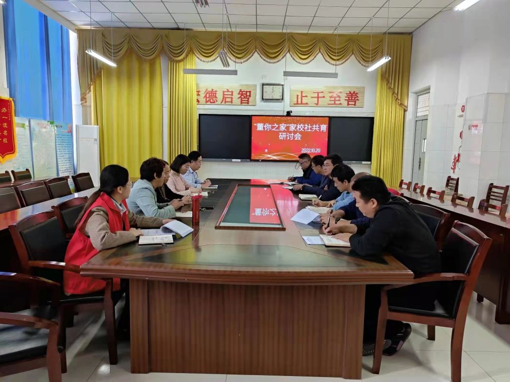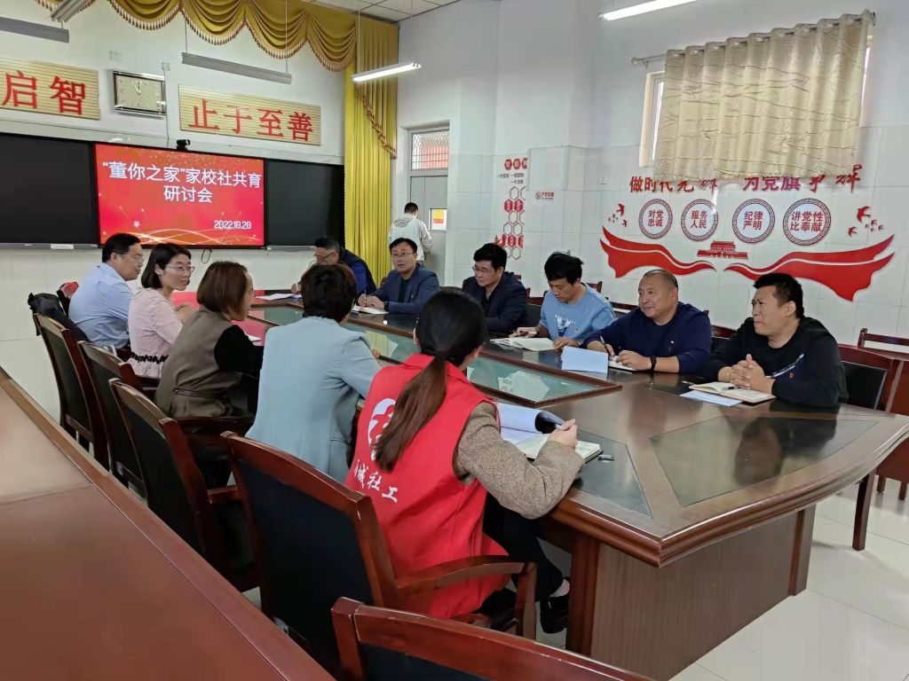 为加强未成年人关爱服务体系,积极落实上级关于对未成年人“合力监护 相伴成长”的要求,10月20日,董家街道社工站结合前期面向中学学生实际生活、学习情况调查问卷结果,联合街道妇联、未保站、学校在董家中学会议室开展名为“‘董’你之家”家校社共育研讨会。