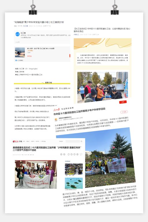 2023年度十六里河街道社工站累计发布新闻稿件70余篇,其中,人民日报1篇;大众网7篇;社工客1篇;济南社工公众号及网站15篇;新视中APP 5篇;市中贴心民政公众号1篇;十六里河街道公众号3篇;简篇44篇。社工站积极发布日常工作动态,及时宣传,直观明了的展示社工站服务内容,让居民更加清晰、深入的了解社工站,满足辖区更多居民诉求。
