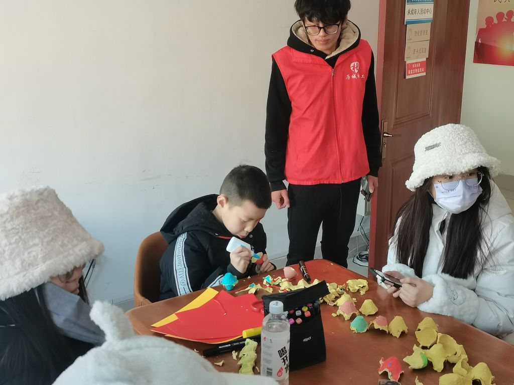 讲解完,大家便开始进行创作,对于动手能力较差的小孩,社工在一旁协助;对于暂时没有思路的小孩,社工与其进行交流引导其发挥想象力;经过一番创作,大家都成功完成了鸡蛋壳的再利用。在接下来的作品分享中,社工发现小孩们的作品都融入了刚刚社工讲解中的可再次使用的思想,完美的阐释了变废为宝。