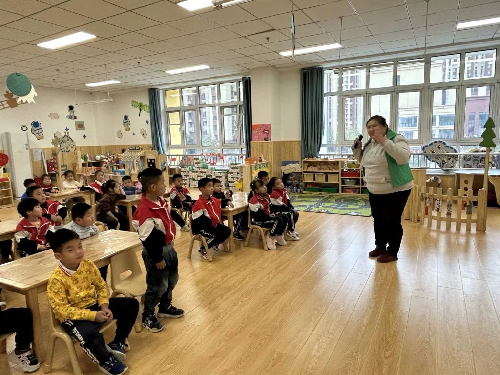 随后,社工来到大四班,为大四班的师生详细讲解一些日常生活中常见的危险场景,并教授孩子们当火情来临之际如何合理求助。考虑到当前孩子们仍处于前运算阶段,因此社工以“过家家”的方式模拟火情来临时孩子们报警的场景。社工邀请小朋友们与自己打电话,模拟拨打119的情景,随后引导小朋友讲述自己的位置以及火情状况,从而学会在火情来临之际如何快速报警。同时社工也告知孩子们任何时刻都要以生命安全为前提,任何活动的开展都要在保护自身安全的前提下进行。