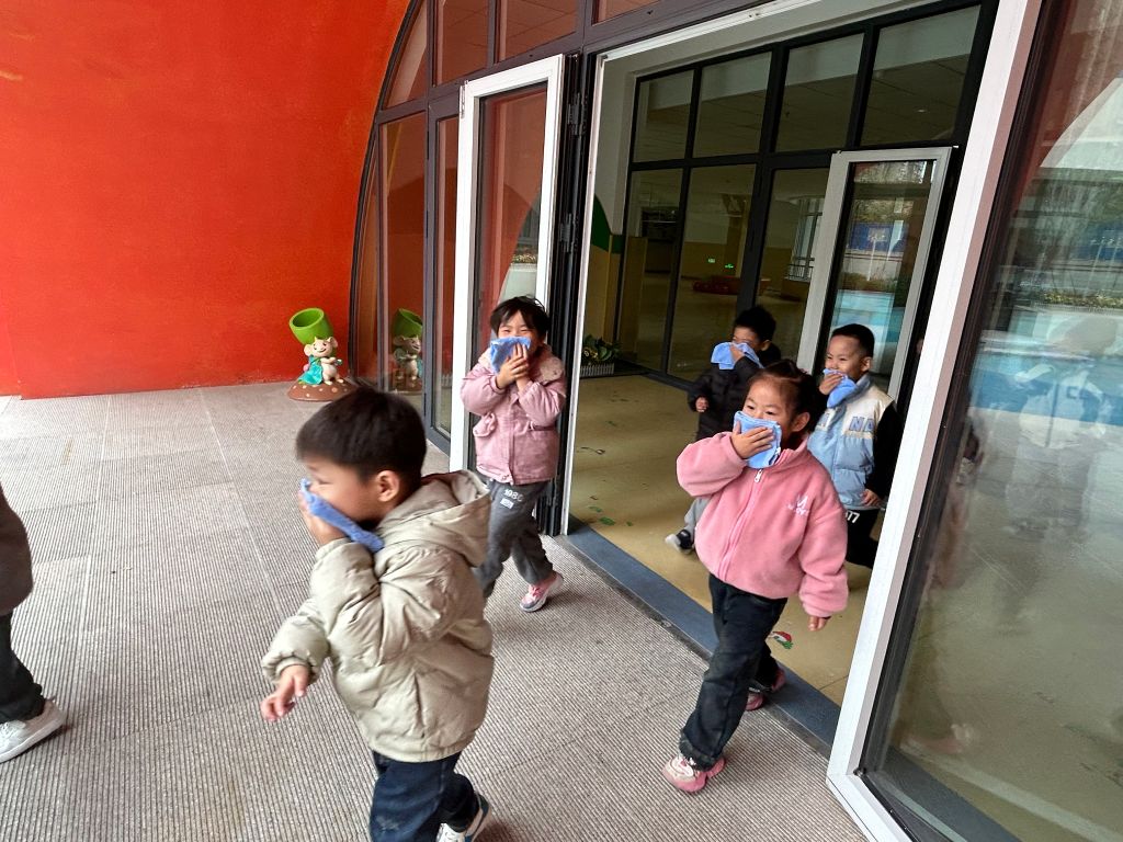 老师们在向小朋友们进行简单介绍后,消防演练活动正式开始。随着警报声拉响,老师带着各班小朋友们快速从安全通道撤离教学楼,孩子们用湿毛巾遮掩口鼻并弯腰躲避浓烟入鼻,仅仅花费4分23秒,全校180名师生便全部撤离到安全地带,并完成人数清点,撤离过程井然有序,演习活动顺利完成。随后,社工以常见的干粉灭火器为例,向给全校师生讲解了灭火器的使用方法,以便在火情真正来临之际实现迅速灭火。