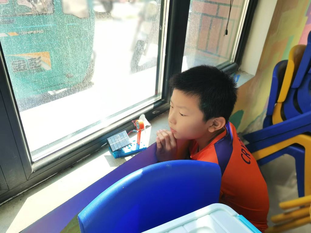 活动开始,社工首先向孩子们介绍了太阳能的基本概念和原理,随后便进入了孩子们最为期待的实践操作环节。在社工的引导下,他们小心翼翼地将太阳能板上的保护膜撕掉,然后将其连接上电机。接着,孩子们将电机安装在底板上固定,再用双面胶把泡沫球粘在底板上。最后,他们用双面胶将太阳能板粘在泡沫球上,装上风扇叶,将整个装置放置在阳光下。