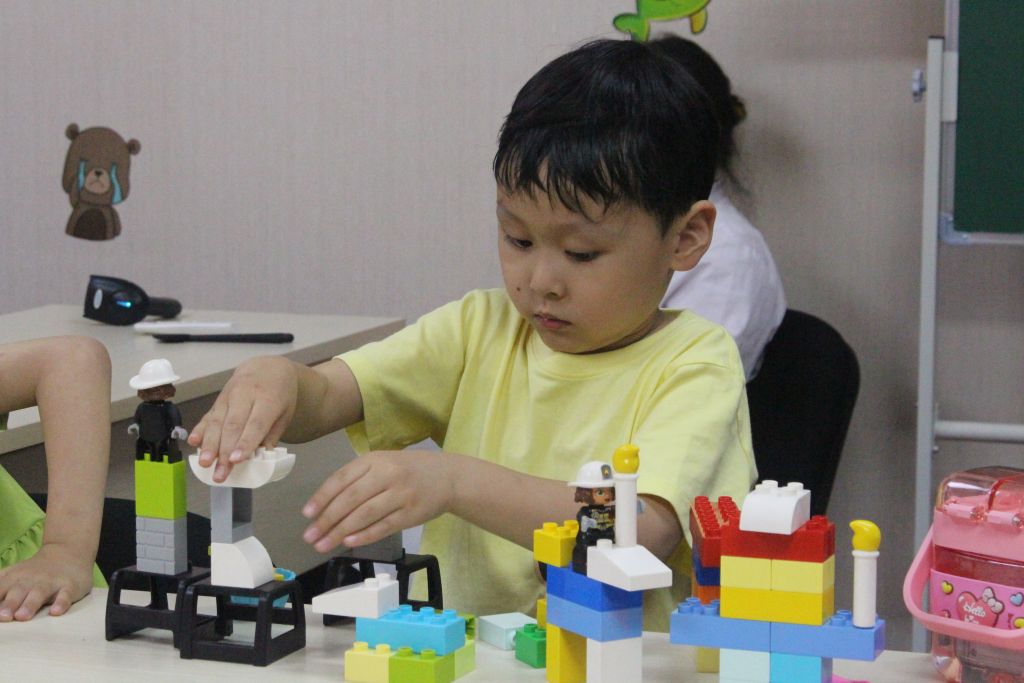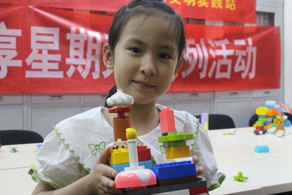 随后,志愿者们将不同造型的乐高,分别放置在不同桌上,供儿童们自由选择自己喜欢的模型开始搭建玩耍。鼓励大家拼出不同形状的动物,孩子们随即安静、专注,在搭建中遇到难题时,或独立思考,或咨询志愿者、社工,努力尝试去解决,小小的多彩方块逐渐在他们的巧手下逐渐成型,每个孩子的脸上都洋溢着满满的成就感!