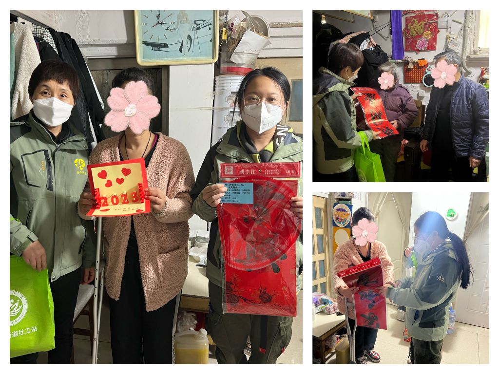 活动中,社工们详细了解了探访对象近期的身体状况和生活情况,与探访对象唠着家常、聊着天,认真倾听老人们的心声,使其在倾诉中缓解内心压力;在行动不便的居民家中,社工们还帮助他们打扫卫生、贴春联、贴窗花,让困难群众感受到浓浓的年味,年近80的张大爷握着社工的手不停的表示感谢:“你们想得真周到啊!也祝你们新年快乐……”。在探访过程中,社工在送上新年祝福的同时还向他们介绍了社工站春节的放假安排,并叮嘱他们保重身体,在疫情“转段”期间要做好个人防护,遇到急事、难事及时联系社工站或社区居委会。