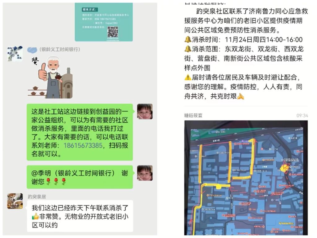 社区有需求,发挥平台作用。环境消杀是疫情防控的重要手段,趵突泉社区为更好地杜绝病毒传播,加强环境整治,做好社区疫情防控,主动联系驻站社工,为此,趵突泉街道社工站充分发挥平台的作用,积极链接到济南鲁力同心应急救援服务中心的志愿者们为趵突泉社区的公共区域及各类设施设备开展精细消杀工作。