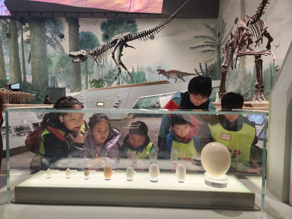 进入博物馆后,社工带领成员们依次参观了“非洲野生动物大迁徙展”、“山东龙—穿越白垩纪”、“晶·彩矿物精品展”、“三千玲珑——中国海洋贝类展”五个展厅,每个展厅主要包含社工讲解与自由参观两部分,“这是巨型山东龙的骨骼化石,它是世界上已知的最大的鸭嘴龙类恐龙,站起来能有8米高,是恐龙家族中名副其实的‘山东大汉’”……社工为成员们讲解展厅内的特色展品,成员们时不时的还会与社工互动,“我才1米4,八米高这都赶上好几个我了!”。在社工讲解完毕后,成员们依照自己的兴趣,选择自己感兴趣的展品仔细观看,“志愿者姐姐,你猜最小的这个是什么蛋?是蛇蛋!”成员兴奋地将自己了解到的知识分享给志愿者。成员们在认真倾听社工讲解以及自己参观的过程中输入知识,又在给他人讲解的过程中将知识输出,无形之中加强了自身对知识的了解和掌握。