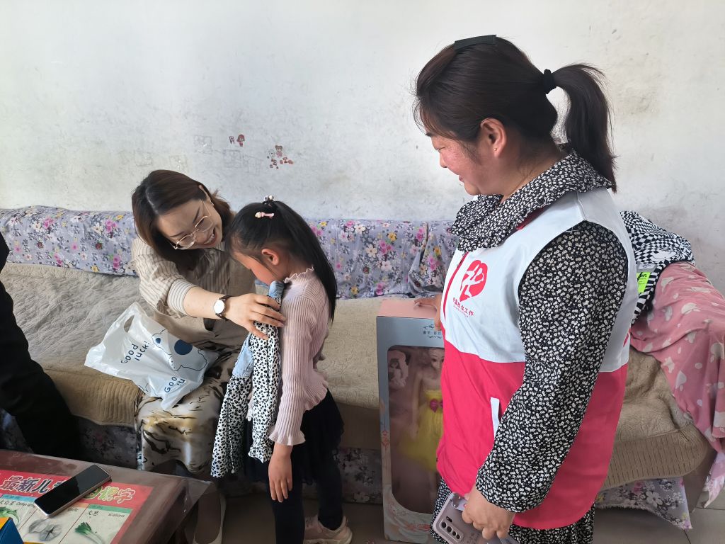社工和志愿者与困境儿童和她的监护人进行谈心谈话,详细了解孩子们近期的生活和学习情况,送给孩子玩具和新衣服,换上新衣服的燕燕特别高兴,志愿者说“我是一名教师,我家也有一个女孩和燕燕同龄,等燕燕放假,我带你俩一起出去玩,我平时一直都有参加志愿服务,我相信凭着充满爱的志愿服务活动,能让燕燕感受到来自社会的温暖。”