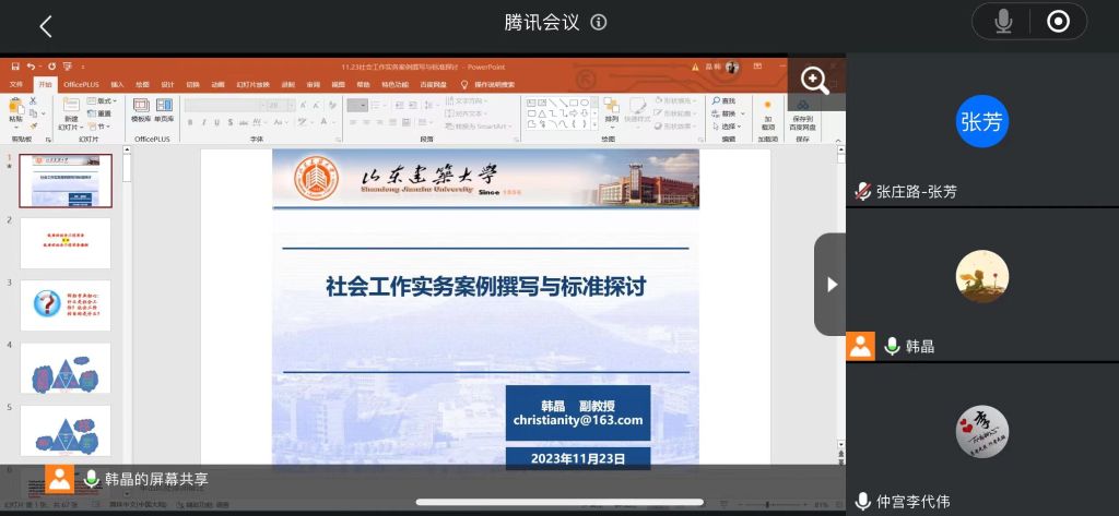 培训会上,韩晶教授通过介绍实务案例的要素、社会工作案例的标准、分析优秀的社会工作实务案例等几方面展开详细授课,重点结合社会工作实务,从案例报告的基本环节、个案报告参考、社区/小组/个案案例写作要点、书写注意事项、经典案例报告解析等方面进行生动翔实、深入浅出地讲授。