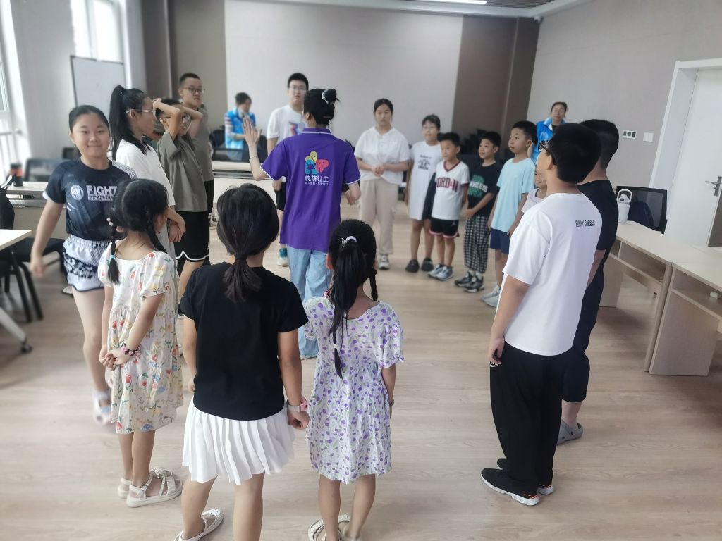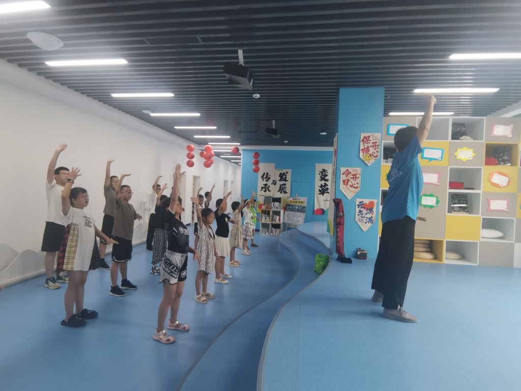 开营仪式上,社工详细介绍了暑期夏令营的活动目的、意义及课程安排,带领破冰游戏“桃花朵朵开”,营造轻松愉悦的活动氛围,帮助组员相互认识,游戏期间成员们均能积极活跃地介绍自己的姓名、学校、兴趣爱好等,较快的消除了初次见面的紧张感和陌生感。随后由社工站孵化的社区社会组织拳心拳力太极拳队伍带领成员们学习八段锦,丰富课间活动培养其耐心和专注力。