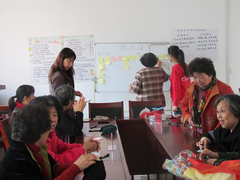 项目社工首先对于此次会议目的进行了简单的陈述,并强调了开放空间会议的规则,随后引导老年人讨论了参加“美味厨房”课堂的快乐和担忧。项目社工给每位老年人发放了卡片,老年人在卡片上写下自己的快乐和担忧,并引导老年人到前面粘贴,很多老年人视力不是很好,项目社工在一旁帮助他们读前面其他老人粘贴的内容,以方便他们了解。对于张贴的内容,项目社工邀请其中一位阿姨为大家分享。接着对于课堂学习内容、活动形式和活动时间也通过张贴卡片、归类的技术进行了征集。最后,通过打分和表决,决定了课堂学习内容的先后顺序和活动时间。