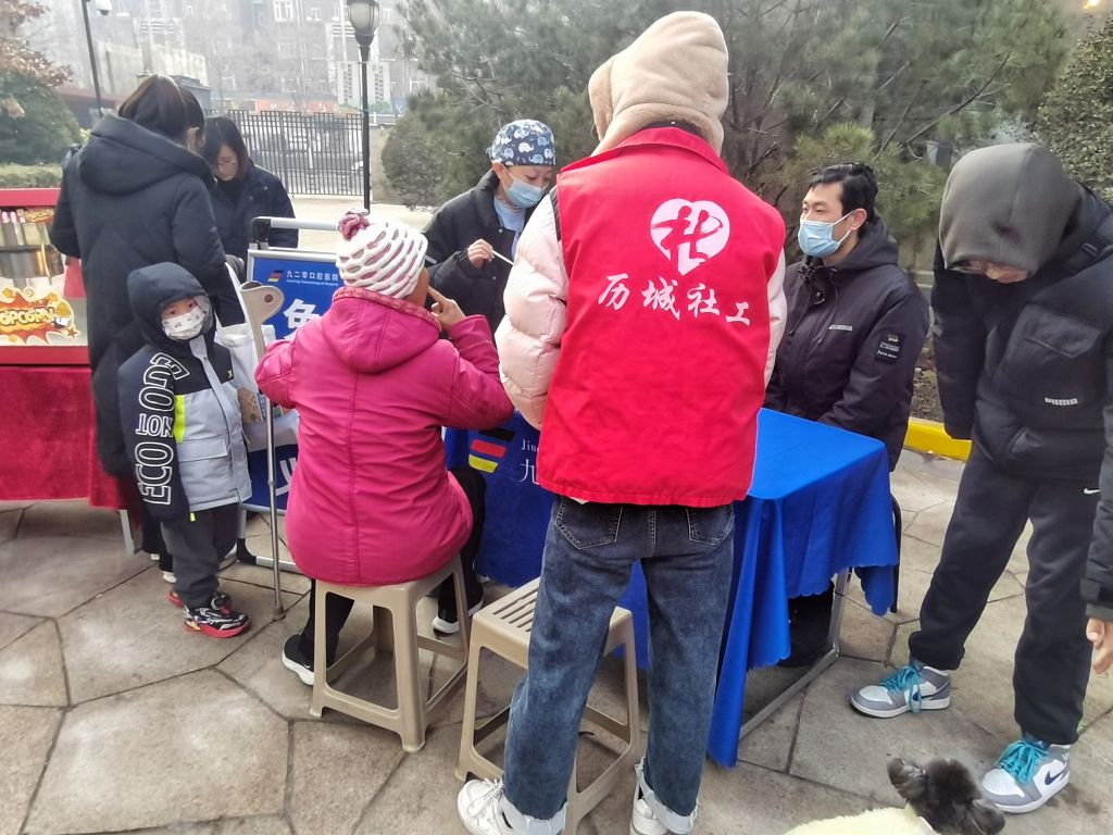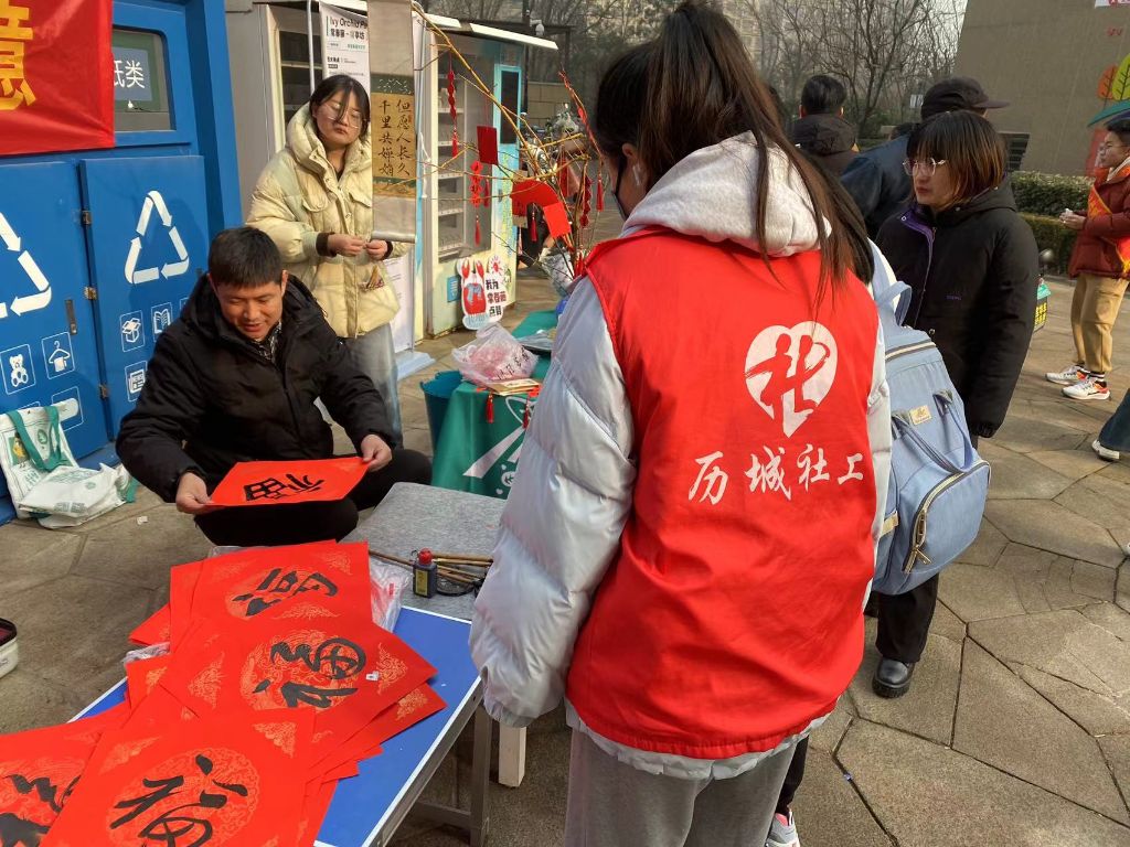 活动当天,社工提前来到活动场地,布置现场,摆好所需物品,引导前来参加活动的居民入场,并介绍各个区块的活动。社工链接了“书法爱好者现场写福字、提意见可抽奖、变废为宝跳蚤市场、爱心义诊、小儿推拿、玩小游戏领爆米花烤肠、现熬姜汤送居民”等资源区块,来满足居民的多样化需求,让居民了解参与公益。