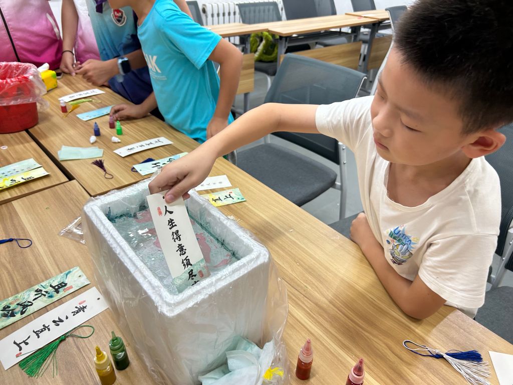 创作过程中,孩子们时而低头沉思,时而相互讨论,彼此间分享着创作的灵感与快乐。社工们穿梭其间,耐心解答孩子们的疑问,给予他们鼓励与指导。随着时间的推移,一张张充满童趣与创意的漆艺书签逐渐成形,它们或色彩斑斓,或简约雅致,无一不彰显着孩子们独特的个性与才华。当所有的书签都完成上色并晾干后,孩子们迫不及待地拿起自己的作品,相互欣赏、交流。他们的脸上洋溢着满足与自豪的笑容,仿佛手中握着的不仅仅是一张书签,更是自己用心编织的梦想与未来。随着一张张独特的漆艺书签在孩子们手中诞生,整个活动室洋溢着成功的喜悦和自豪的氛围。这些书签不仅是孩子们艺术才华的展现,更是他们对中国传统文化理解和认同的见证。