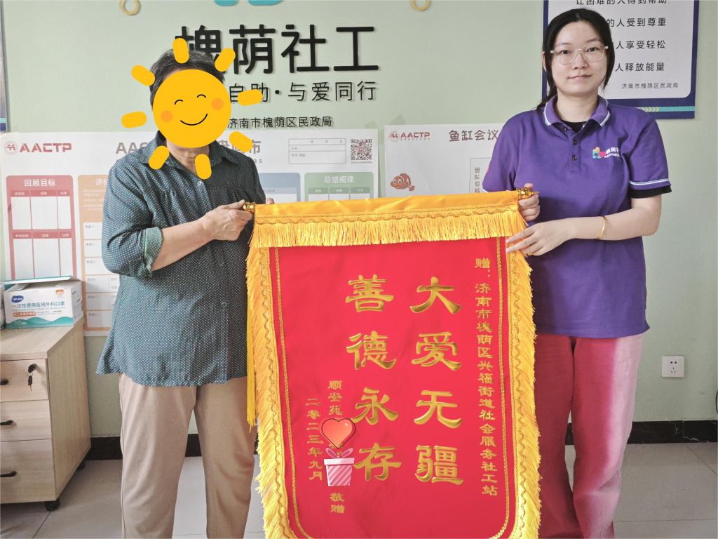 2023年9月13日上午,济南市槐荫区兴福街道社会工作服务站(后文简称“社工站”)收到了服务对象奶奶送来的锦旗,感谢社工对其孙女小玉(化名)一年以来的关怀与服务。