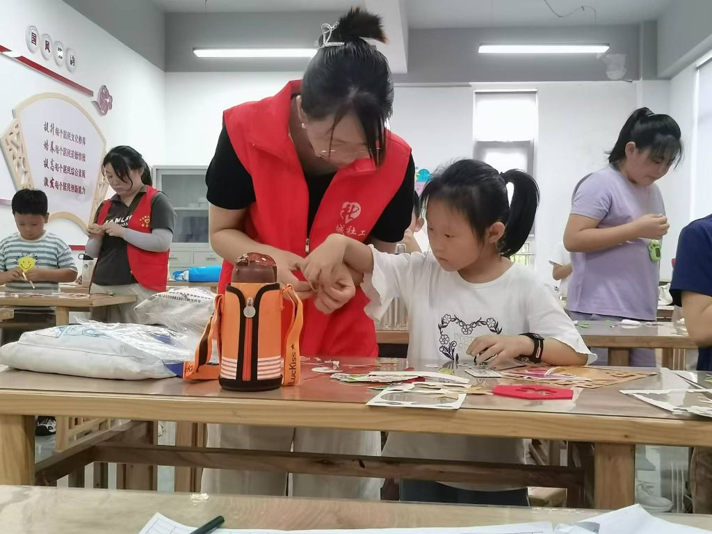 社工首先通过一段生动的动画视频,向组员介绍了二十四节气的起源、含义以及它们与农业生产、日常生活之间的紧密联系。视频中的精美画面和趣味解说,让孩子们目不转睛,兴趣盎然。接着,社工将准备好的二十四节气挂饰发到组员手中,引导组员动手制作节气挂饰,组员们将节气挂饰上的装饰抠出来,对照着说明书找位置,用胶水粘贴上去。在制作过程中,不仅锻炼了动手能力,还进一步加深了对节气的认识和喜爱。