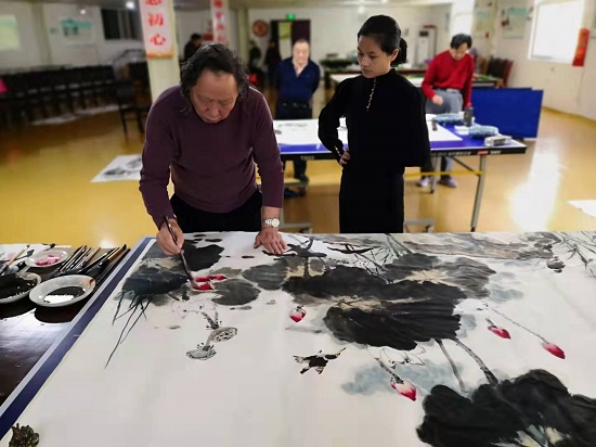 活动中,书画家们现场笔歌墨舞、尽情挥洒,用精湛的艺术手法创作了一幅幅飘逸灵动的画卷,随着笔锋的翻飞转动,一幅幅书画作品或大气磅礴,或灵秀飘逸,或浓墨重彩,或素雅简约,活动室内洋溢着笔墨的清香和艺术气息。苍劲有力的书法、意境深远的山水画、亭亭玉立的荷花吸引了在旁观摩的目光,深受现场群众的喜爱,赢得了阵阵赞叹。大家聚在一起时而交流书画,时而相互解惑,享受着书画带来的乐趣,在有增无已知识的同时还结交到了志趣相投的新朋友,整个活动室充满了喜气洋洋的气氛。