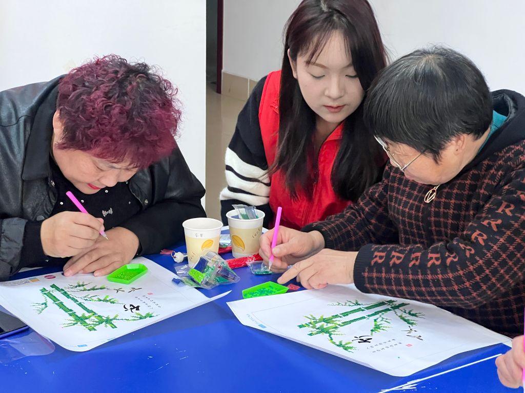 随着属于自己钻石画的发放,组员们迫不及待的开始为那尚未完成的画作增添新的色彩,钻石画上色彩一步一步变得鲜艳,而面对绘画活动途中出现的困难和问题,组员们齐心协力,大家一起讨论应对方法,互帮互助,克服困难。这种创造性,互助性的过程给组员带来一种愉悦和满足感,组员的关系更加密切,成就感油然产生。