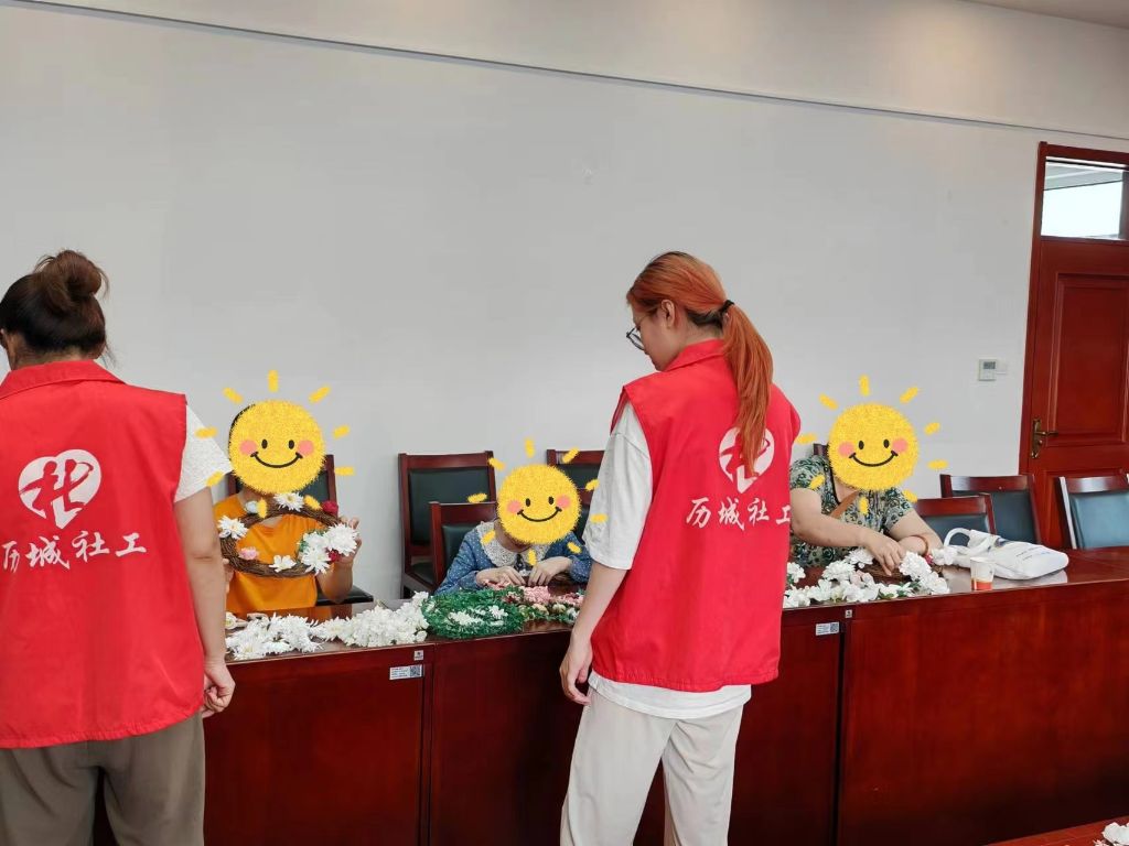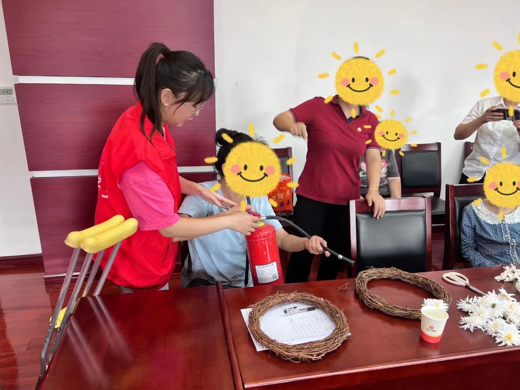 伴随着消防培训结束,小组活动进入第二个环节:花环制作。社工提前将准备好的藤条圈、藤条、仿真花等物资摆放到桌子上,社工拿起一个藤圈向成员讲解到如何将仿真花插入藤圈中、如何将藤条缠至藤圈上,“你们可以根据自己的想法创意,开始动手吧!”随着社工的话音落下,小组成员开始自由发挥。“小心着手,别扎到”活动进行中社工提醒成员,不一会儿,成员们将秃秃的藤圈变得有生机了,纷纷拿着自己满意的作品向我们展示,看着小组成员露出灿烂的微笑,社工收获了满满的成就感。