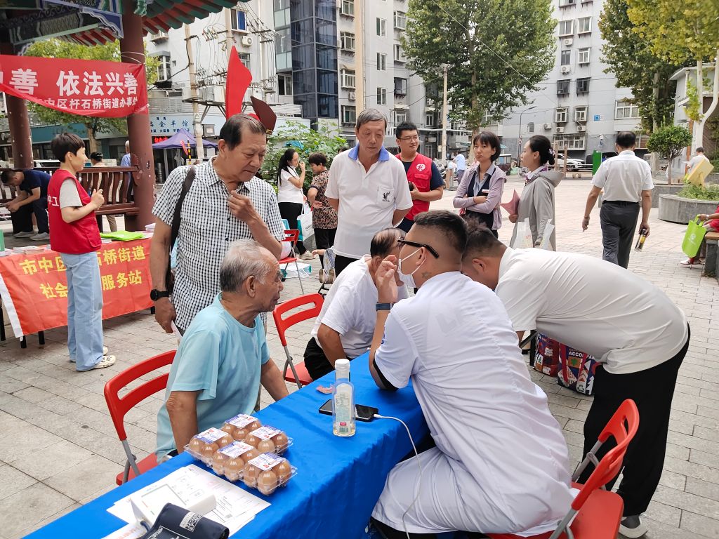 活动当天,社区广场上热闹非凡,吸引了大量居民前来参与。为落实“崇德向善,依法兴善”的活动主题,社工站联合众牙口腔、科恩口腔、南郊医院、青岛银行、绿地养老、天工日间照料等多家企业及社会组织,共同为居民提供了一系列便民服务。