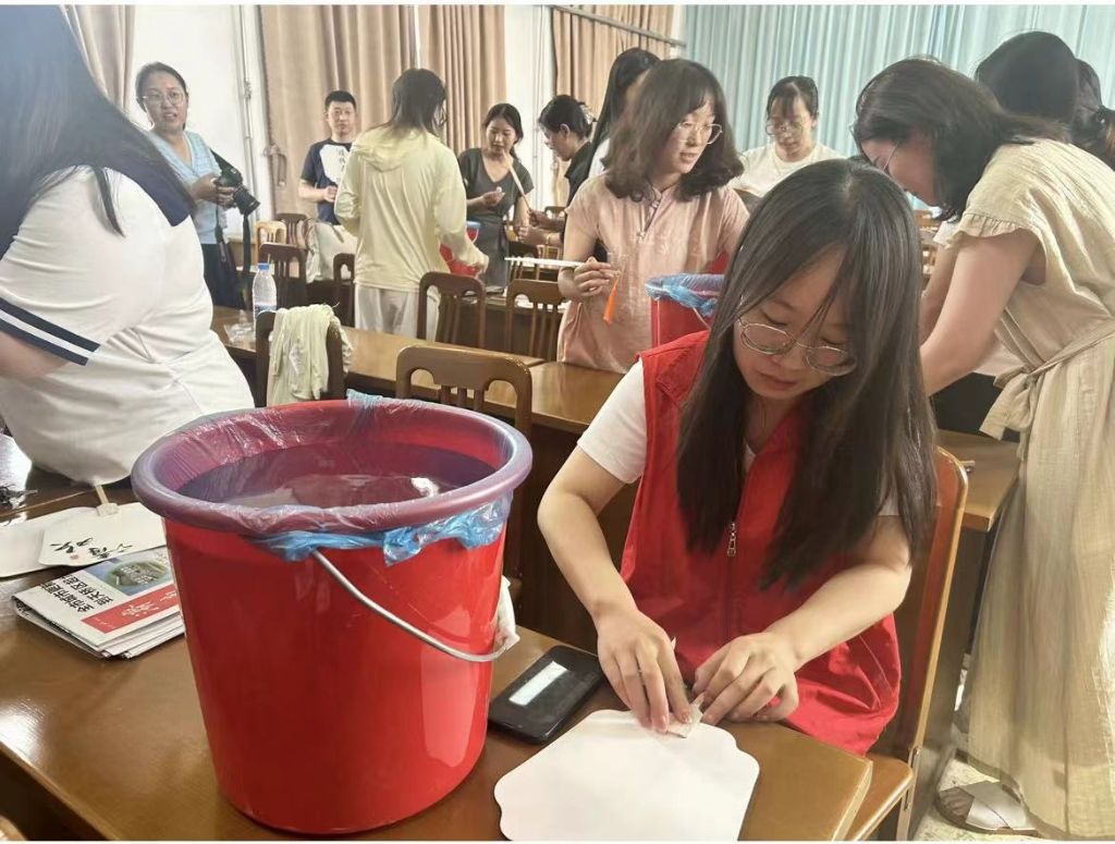 活动开始,社工首先向大家讲解了非遗漆扇的历史渊源、制作工艺以及传承价值等知识,随后详细演示了漆扇制作的具体方法和注意事项。大家一边学习制作手法,一边将扇子缓缓沉入水中,晃动、旋转、提起,以漆为笔,以水为墨,一把把传统工艺和现代设计有机结合的漆扇便跃然眼前,蕴含着丰富的文化内涵和时代气息。每个人都对自己独一无二的作品爱不释手,大家相互分享,相互传授经验,现场一片欢声笑语。
