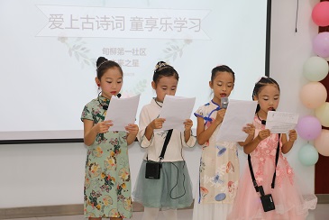 原来,此次活动由甸柳第一社区新培育的社区社会组织“未来之星”团队举办,为锻炼社区低龄青少年熟读背诵古诗词,传承国学文化,甸柳第一社区几位热心家长组建“未来之星”团队,以“爱上古诗词”公益项目积极参与社区微创投大赛,在社区支持下,举办“爱上古诗词,童享乐学习”汇演活动。
