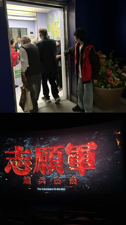 电影开始前,社工在影院附近沿路引导,指引老党员们到达观影地点,电影《志愿军:雄兵出击》 主要讲述了1950年朝鲜内战爆发后,中国人民志愿军在新中国一岁之际跨过鸭绿江入朝作战,保家卫国的故事。通过呈现志愿军首次歼灭韩军的两水洞战斗、14小时奔袭72.5公里的三所里战斗和以百人之力阻敌十几个小时的松骨峰阻击战等三场重要战斗,带领观众回望70多年前的峥嵘历史,铭记人民志愿军的不朽精神,向新时代中华儿女传递英雄先辈保家卫国的信念力量。