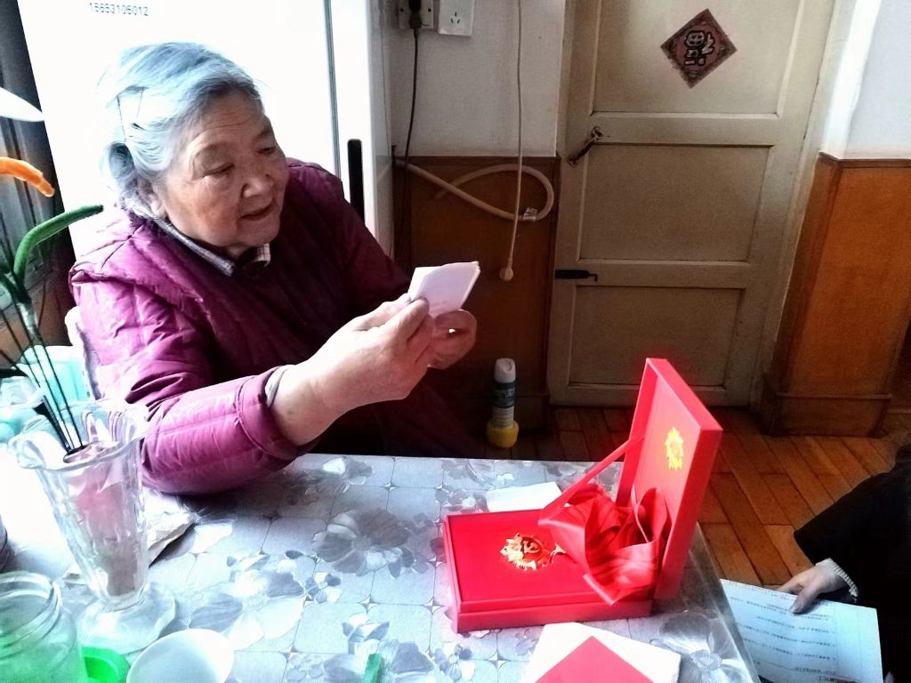 张秀兰老人给社工展示自己“光荣在党”50年纪念章