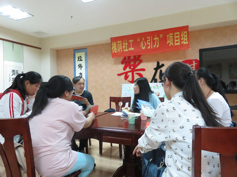 为促进同工之间的交流合作,2016年5月25日下午2:00,槐荫“心引力”项目组接待了来自市局的同工们前来交流,其中有市局负责人、济南优抚医院、儿童福利院、莲花山殡仪馆、社区福利中心等项目点的六名社工。