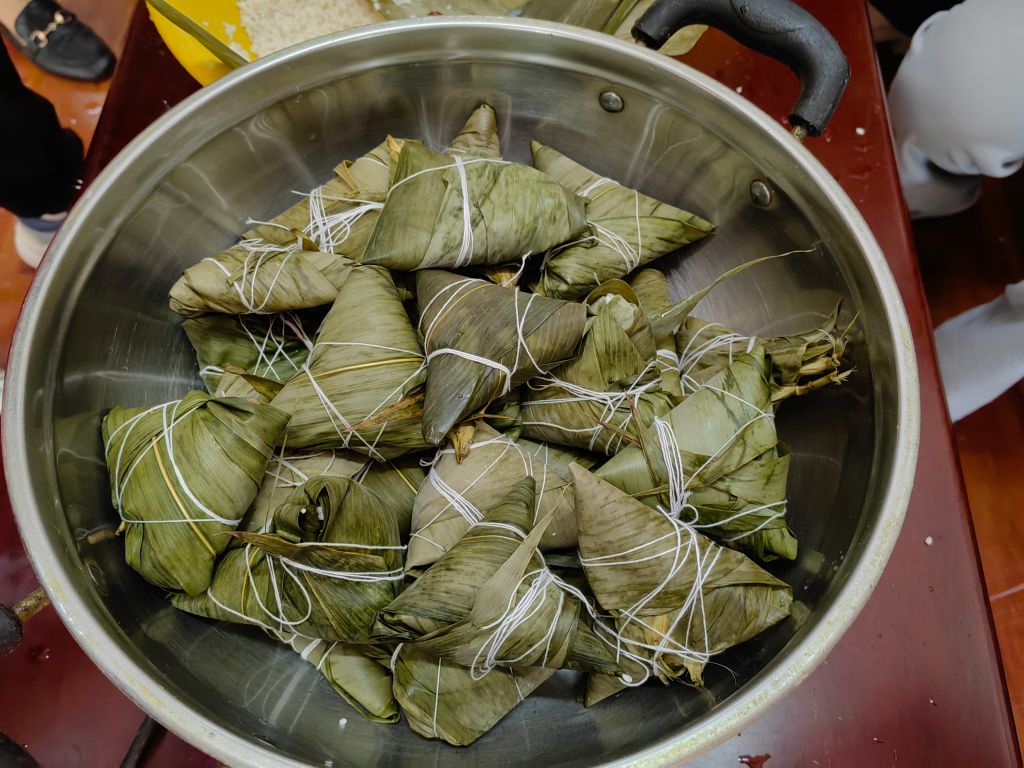 活动伊始,社工早早的准备好包粽子的材料:粽叶、糯米、大枣及盆、桶、线、剪刀等必需品。与村两委成员、社区居民及志愿者共同动手包粽子,折粽叶、填糯米、加馅料、裹叶子、扎线条……大家一边探讨着包粽子的技巧,一边分享着端午节的习俗,气氛融融欢声笑语不断。在大家的共同努力下,形态各异的粽子应运而生。
