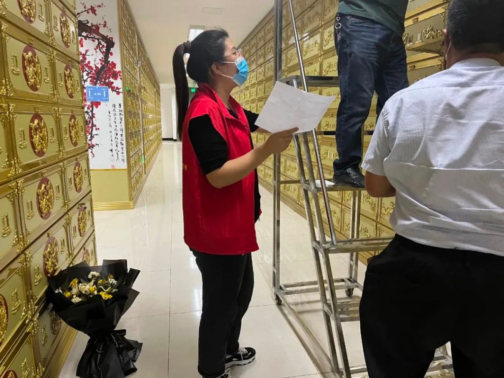 永宁堂迁坟工作主要程序为以村居为单位,先签署骨灰安放协议,再集中安置骨灰。在骨灰安放协议签署过程中,起航社工耐心办理业务,引导逝者家属理清坟茔数量、逝者辈分安排、逝者棺数安排、协议签署,社工直接分配好位置,安放协议一式两份,逝者家属迁坟时带来永宁堂,为下一步工作打好基础。签署完毕骨灰安防协议的村居,进行大规模的坟茔迁移工作,逝者家属将骨灰盒迁来永宁堂骨灰楼,社工及工作人员引导家属到达协议中的分配区域,指导家属安放方法、按棺数安排逝者位置以及口头宣传永宁堂祭拜须知,为逝者点燃生命长河中的最后一盏灯。