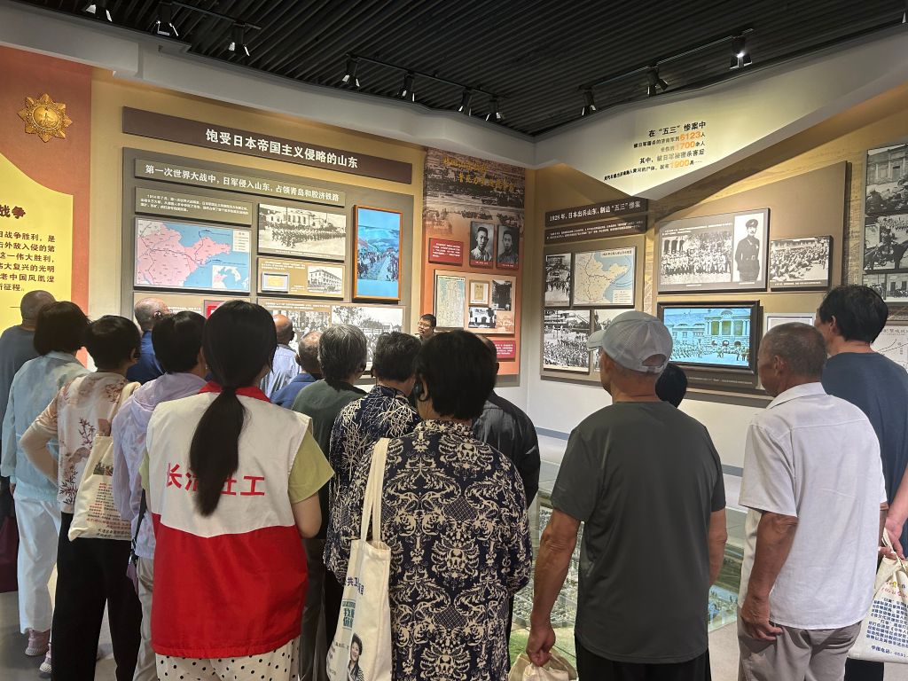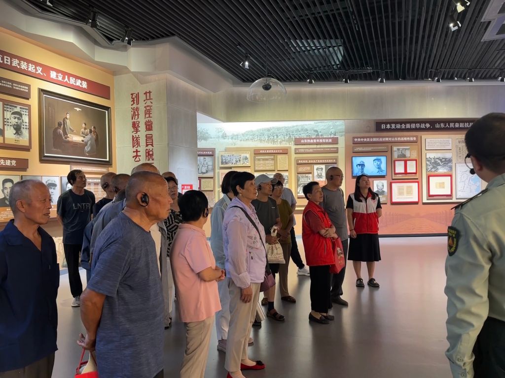 在社工的引导下,老党员们有序进入纪念馆,首先来到了第一个展厅“齐鲁御寇血铸长城”,这里展示了抗日战争时期山东军民在党的领导下,浴血奋战、保家卫国的壮丽画卷。老党员们驻足观看,不时发出感叹声,仿佛回到了那个战火纷飞的年代。