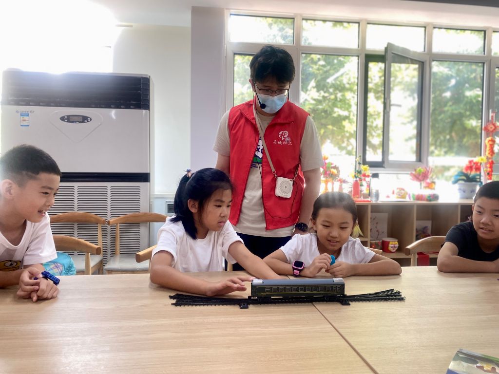 本次活动邀请到了在铁路部门工作的志愿者,志愿者哥哥首先介绍了铁路的发展历史以及高铁的相关知识,并通过火车模型带领小朋友们学习火车行驶中如何拐弯,不仅使全体儿童对铁路知识有了更深刻的了解,也使大家对“中国高铁世界第一”有了更加深刻地认知,增强了全体儿童的民族自信心和自豪感。