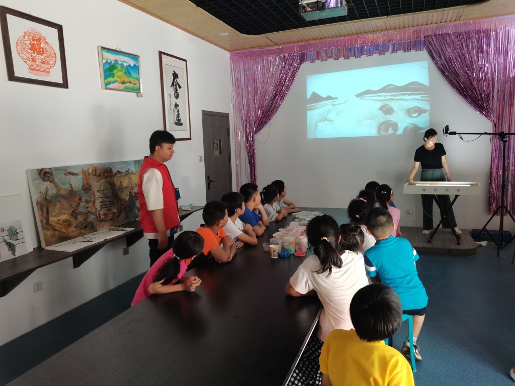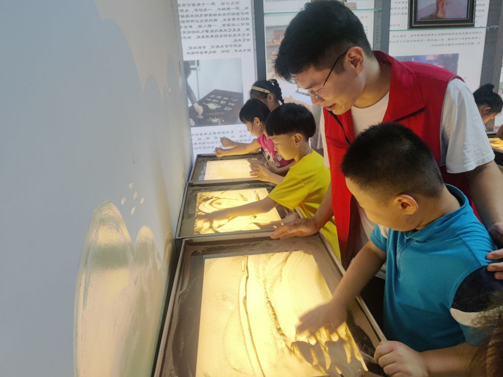 在社工和志愿者的组织下小朋友们陆续来到了瀚漠沙画艺术馆,刚进入展馆,浓浓的艺术氛围就笼罩着我们,墙壁上挂满了丰富多彩的绘画作品,激发了孩子们极大地兴趣。老师又在沙画教室为小朋友们现场表演创作沙画,为小朋友们详细讲解沙画的创作手法和技巧,手把手地教孩子们如何撒沙、抹平、制画,随着沙子在指间的舞动,一幅缤纷美丽的沙画作品在稚嫩的小手里诞生了,看着完成的作品,小朋友们脸上露出了开心的笑容。