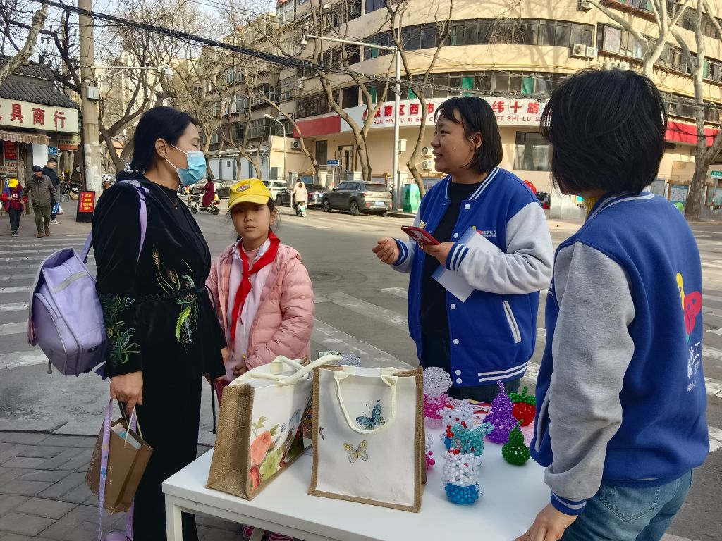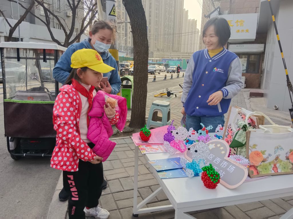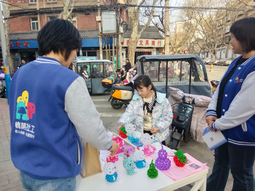 社工们经过精心策划,瞅准孩子们放学的时间段,在纬十路小学附近选择了一处宽敞的地方,拉上条幅,摆好展台。在家长的陪伴下,孩子们被精美可爱的手工作品吸引而来,看看这个、摸摸那个。社工趁机向他们介绍社工站开展的各类少年儿童服务,普及预防校园欺凌的安全知识,还发放了《未成年人保护法》宣传手册。有的家长在了解了社工服务后,愿意参加社工站开展的活动,主动要求加入社工站的青少年服务群。