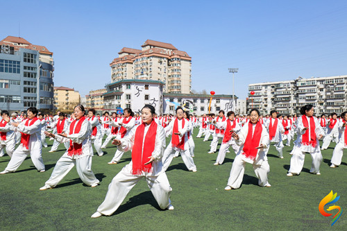 在全民健身运动会开幕式前,槐荫北斗星项目组太极拳成员由阎叔叔带领着,穿着白色的练功服,带着红色的围巾,面带积极昂扬的笑容姿态,形成了场上一道亮丽的风景线,展现出了太极人的刚柔并济。