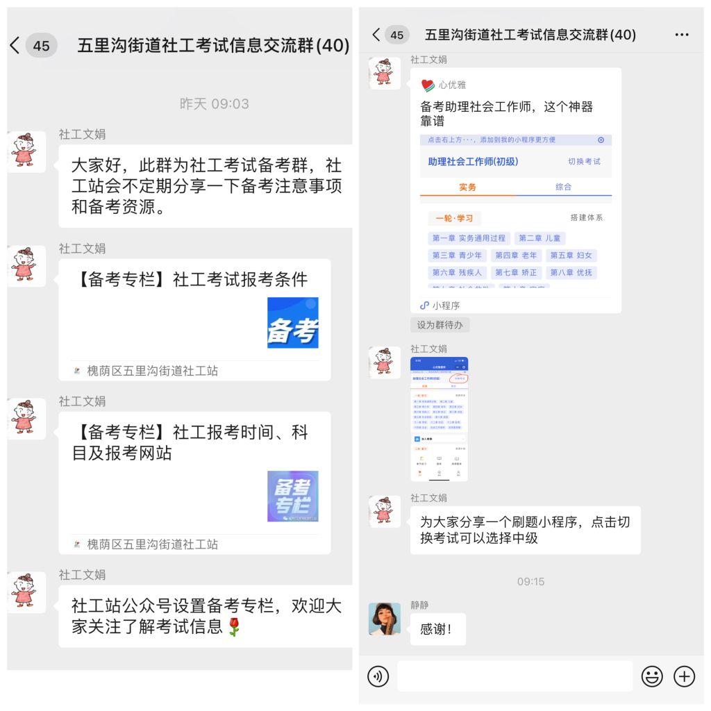 从前期的走访中,社工站了解到社区工作者想要通过社会工作者职业水平考试提升自我的意识强烈。为了更好地宣传社会工作考试信息及相关知识,社工站在公众号平台开设“备考专栏”,及时更新备考信息及社会工作专业知识。同时,社工站还为有考试意愿的社区工作者建立“考试信息交流群”,在群里发布相关信息、备考技巧及备考小程序等,让微信群成为助力社区工作者参加今年社会工作考试的“加油站”。