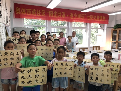 7月27日下午伴随着最后一堂书法教学的结束,奥体西苑“阳光共享·老少同乐”七彩公益课堂走进了尾声。为期一周的公益课堂孩子们学到了书法、声乐、剪纸手工等丰富的课程,老年志愿者们有的以团队有的以个人进行志愿服务,整个过程中他们不仅发挥了个人特长也将志愿服务更加深入更加细化。