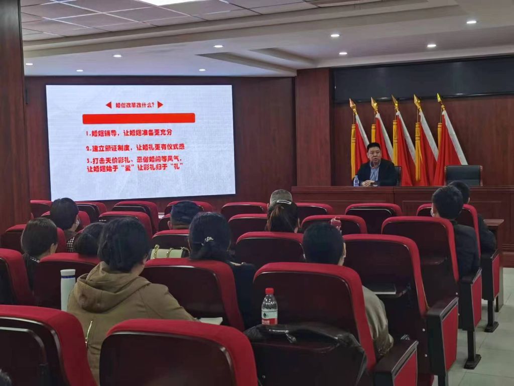 孟一兵会长立足济南当地婚俗,从开展婚姻辅导让婚姻准备更充分、建立颁证制度让婚礼更有仪式感、打击天价彩礼和恶俗婚闹恶习让婚姻始于“爱”让彩礼归于“礼”三个方面进行了移风易俗宣讲,对当前婚俗改革的形势、重点、原则、政策理论、措施、典型案例等作了深入浅出的讲解和分享,对美里湖街道下一步婚俗改革提出了前瞻性建议。