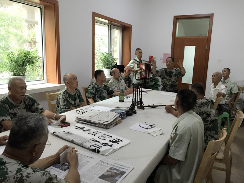 在小组领袖优抚对象赵绪顺大爷的组织下,声乐小组在人员、内容和形式上实现了创新和发展,音乐的魅力无穷,平阴县所有爱好唱歌的优抚对象均参与到其中,共同唱响革命年代的熟悉旋律。他们当中个个技艺非凡,手风琴、二胡等乐器不相上下,声乐小组中还发展出指挥手,在乐器与指挥手的双重配合下,大家聚在一起享受音乐带来的快乐和正能量并相互切磋着技艺与歌喉。在社工的引导中,大家一起回忆每一首歌曲背后的故事,感受当下生活的来之不易。