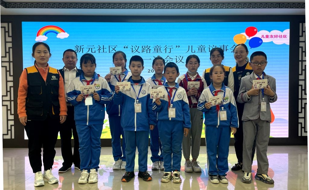 随后与会领导及儿童议事会成员代表上台,共同开启了新元社区2023首届“议路童行”儿童议事会项目,并为社区小议员们颁发议员证和积分存折。