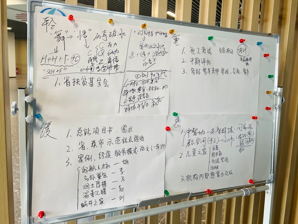 督导老师张晴将白板板面分为“轻、重、缓、急”四部分,协助总站梳理近期工作要点,在一问一答的良效互动中将一季度工作成果与短期服务任务有规划地放在四个格子中。以项目案例的方式,引导总站社工打开思路,为指导各街道开展个案及小组工作提供了专业性意见。同时,结合街道重点工作、辖区特点、居民需求,推动实施特色项目计划,“1个街道社工站+1个特色项目+N个创新项目”。设立居民意见反馈机制,制作意见反馈册,对各站点提出针对性改进建议,提高总站及各社工站建设规范化水平,使街道社工站更精细、更具温度。接下来,总站将通过中期评估+街道考评,对社工站服务的有效性、创新性、可持续性等进行全方位评估,切实推动社工站规范化管理运行。