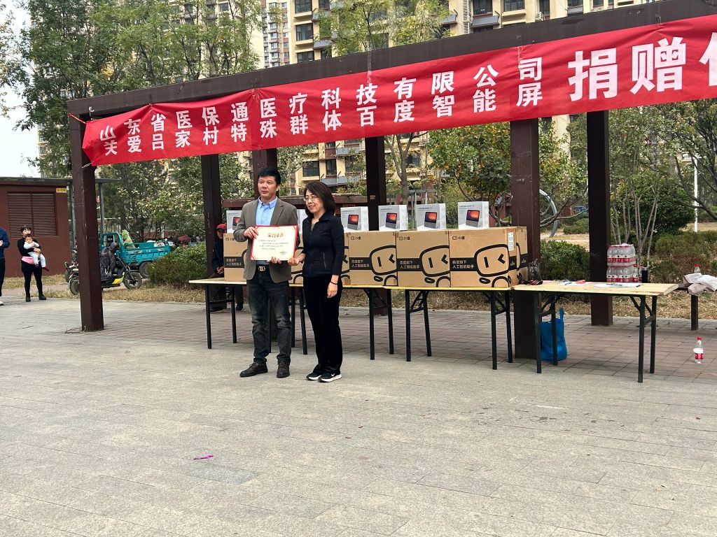 凉凉秋风送温暖,丝丝关爱入心田。11月3日,董家街道民政办、社工站、残联、计生协开展“关爱特殊群体,将爱洒向人间”捐赠仪式活动,辖区退休党员吕素强同志链接山东省医保通医疗科技有限公司为吕家村的老年人以及残疾人捐赠智能陪护设备百度智能屏100台,董家街道党建办副主任唐渊同志、民政办主任赵而强同志和虞麓花园联合党委书记、董家管区总支书记苏超峰同志出席本次活动。