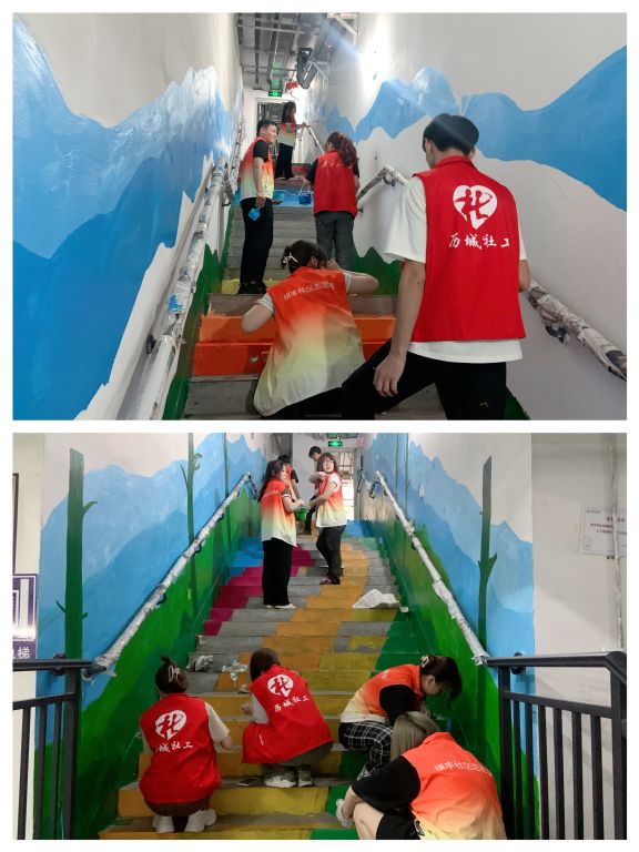 6月12日至16日,唐冶街道社工站组织山东青年政治学院设计艺术学院“梦华”大学生社会实践团队走进银丰唐郡牡丹园社区,开展社区楼道彩绘涂画志愿服务活动。