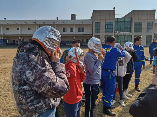 在室内火灾逃生演练环节,蓝天救援队队员对逃生路线、方法进行讲解。演练开始,随着模拟烟雾弹烟雾扩散,在蓝天救援队队员的指导下,社工、志愿者带领孩子迅速、有序地到达室外操场指定的安全区域,整个演练过程紧张有序、实用性强,达到了预期效果。