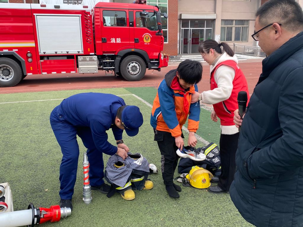 社工与消防员提前与校领导沟通,明确了演练要求,为演练成功提供了切实的保证。活动现场,消防员以我问你答的形式,将平时大家不易记住的消防知识变成生动有趣的互动问答,提高了青少年的消防安全意识。消防队长讲解常用的手提式干粉灭火器的使用方法并示范了使用消防水带、消防水枪进行灭火。随后选出一位学生代表试穿了消防员的衣服,说出了穿上后的感受,说好沉重啊。最后引导学生有序的参观了消防车并讲解了各项功能。