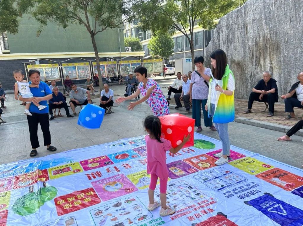 社工向大家简单介绍了运动会规则,并邀请大朋友和小朋友们积极参加飞行棋闯关游戏、掷骰子、回答回答垃圾分类趣味小知识,“飞行棋”的一步步移动带动的不仅是居民玩游戏的激情,还有居民学习垃圾分类知识的热情。现场社工在引导居民游戏的同时,还适时地向居民讲解了他们不了解的垃圾分类知识,真正做到让居民们寓教于乐,培养了垃圾分类和环保意识。