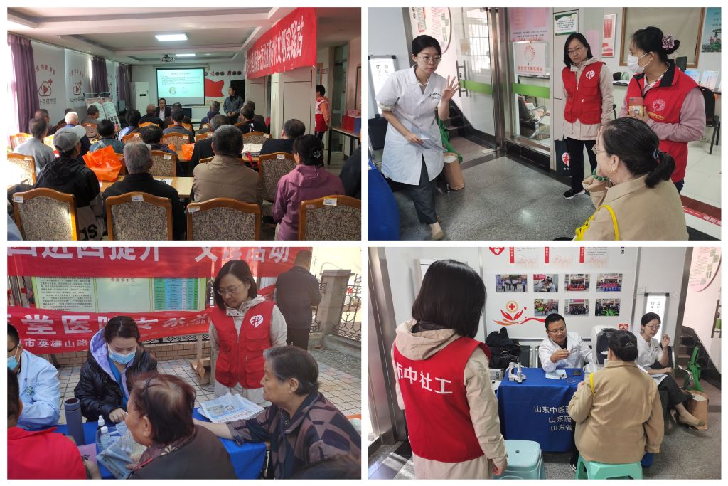 在健康讲座上,医生以图文结合的方式向老人们讲解了心脑血管疾病的发病病因、疾病的预防及急救措施,用通俗易懂的语言讲解了老年人应如何预防和控制关节炎,同时提醒要注意合理膳食,适量运动,定期检查身体,积极预防和控制心脑血管疾病、关节炎的发生。讲座结束后,社工带领老人们来到义诊现场,本次义诊共两个服务项目,一是中医义诊,正煌骨科中医专家为老人们提供测血压、中医把脉等健康服务,通过“望、闻、问、切”的方式问诊,细心地进行中医初步诊断,为有需要的老人提供现场理疗并给出进一步治疗建议。二是眼科义诊,山东中医药大学附属眼科医院的医务人员为老人们检查眼睛,解惑答疑,积极普及眼科知识,告知他们定期检查眼睛的重要性。在医生的建议指导下采取措施或及时就医,排除眼病风险。